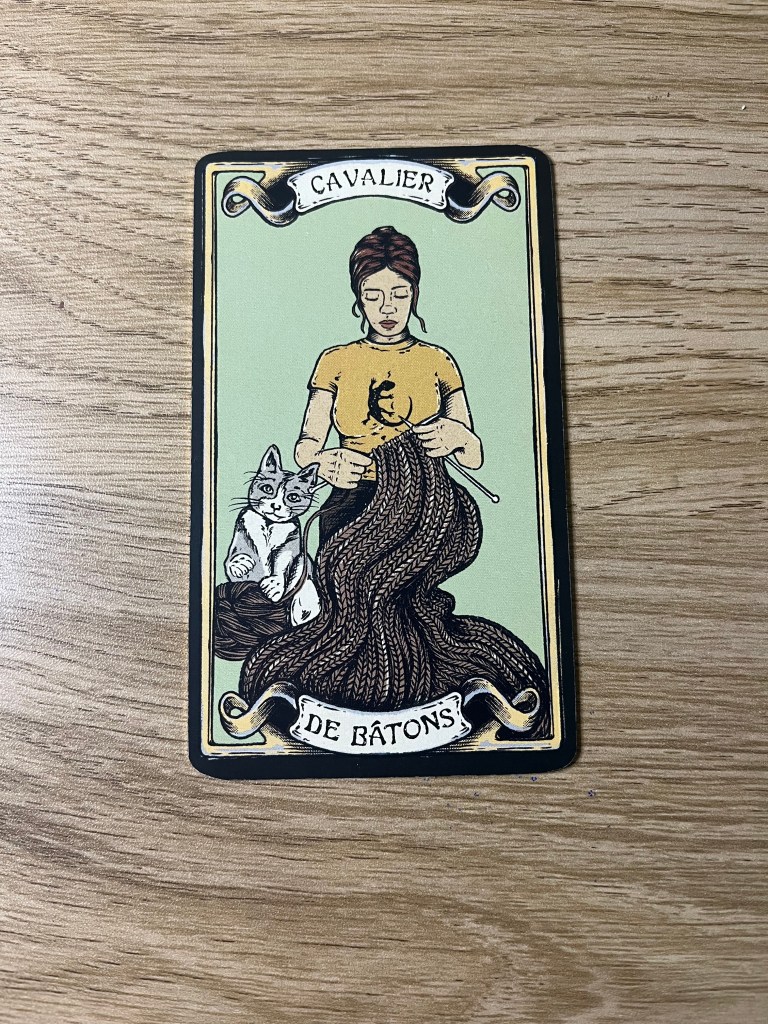 Esta versión del Caballero de Bastos nos invita a replantear la idea de avanzar. Aquí no hay caballos desbocados ni explosiones de energía impulsiva. En cambio, vemos a una mujer tejiendo, acompañada de su gato. La acción está, pero es otra. Es la acción que nace del compromiso constante, de un propósito que se va hilando día a día.